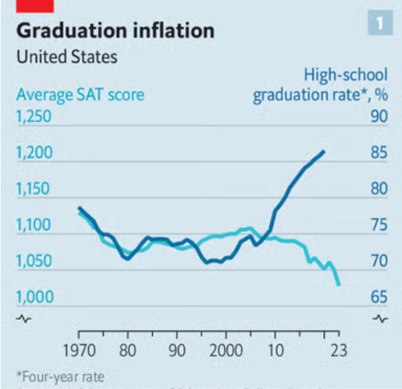 What could possibly be the reason for such a significant change in how colleges admit their students? Several factors have changed since then, but the two most notable are the increasing rate of high school graduates and the rapidly dropping average SAT scores, as shown by the graph below from The Economist.